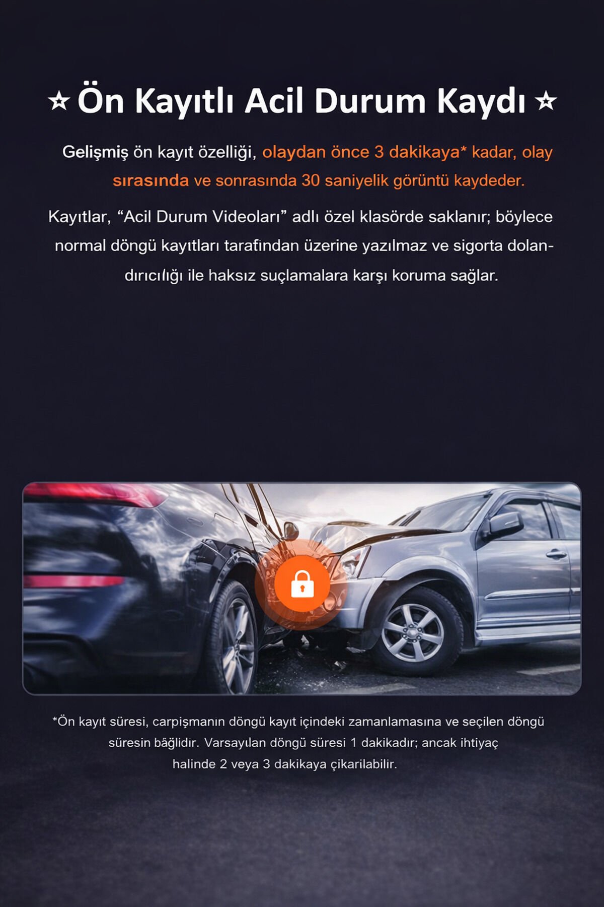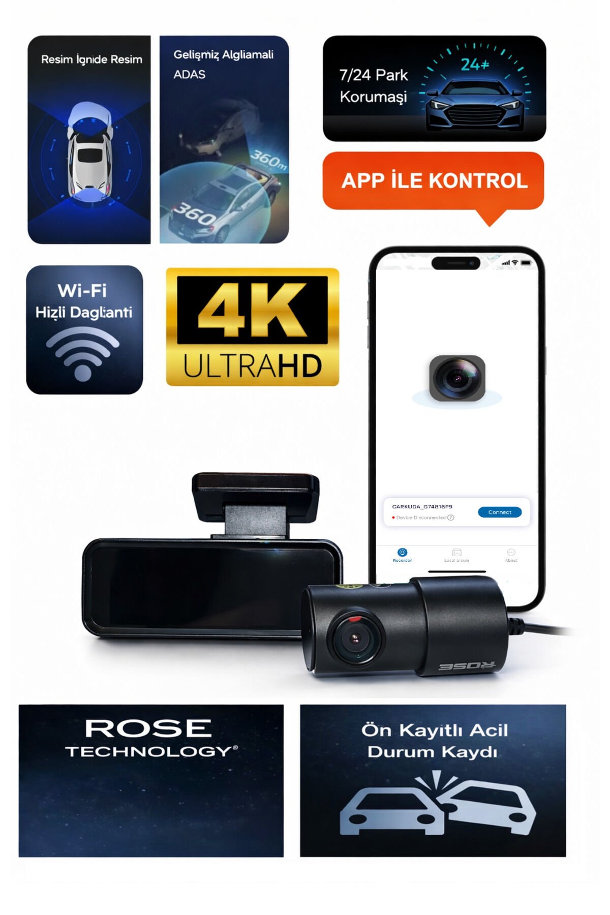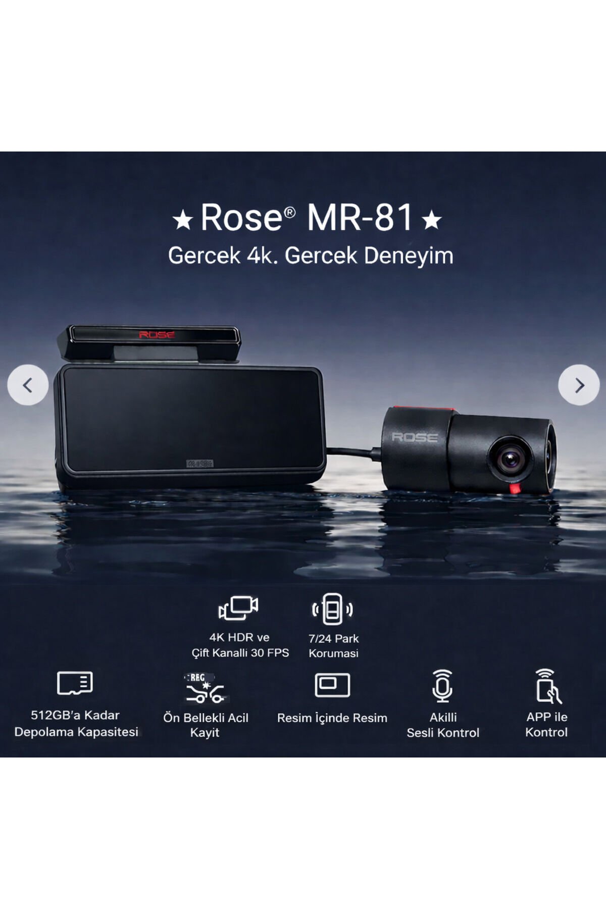 ROSE MR-81 4K + 2K Dual Kamera | WiFi | 512GB Destek | Park Modu ROSE MR-81, araç güvenliğinizi üst seviyeye taşıyan ön + arka çift kameralı araç içi kamera sistemidir.; Gelişmiş 4K ön kamera ve 2K arka kamera sayesinde gündüz ve gece net kayıt alır, park halindeyken aracınızı korur.;