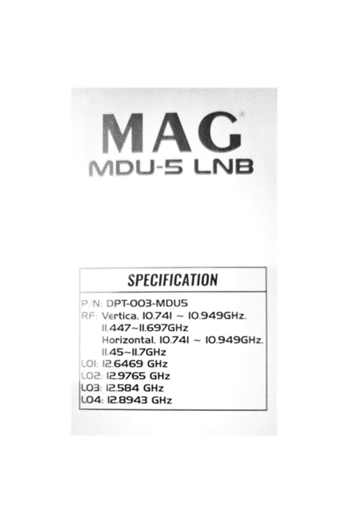 Mag MDU-5 LNB Özellikleri P/N : DPT-003-MDU5; RF : Dikey : 10.741 - 10.949 GHz Yatay : 10.741 - 10.949 GHz, 1145-117 GHz; LO1 : 12.6469; LO2 : 12.9765; LO3 : 12.584; LO4 : 12.8943; CE Belgeli; MLK1554484948